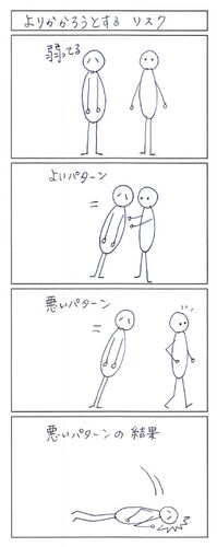 人に頼ることができないのは、ひとえにこの4コマ目を恐れているから。 頼ろうとする時点でバランスを崩しているので、誰かに支えてもらえなければ倒れてしまう。 これを怖がらない人は強いと思う。 倒れた後でも行ってしまう人を呼び止められる人も強い。 あ…