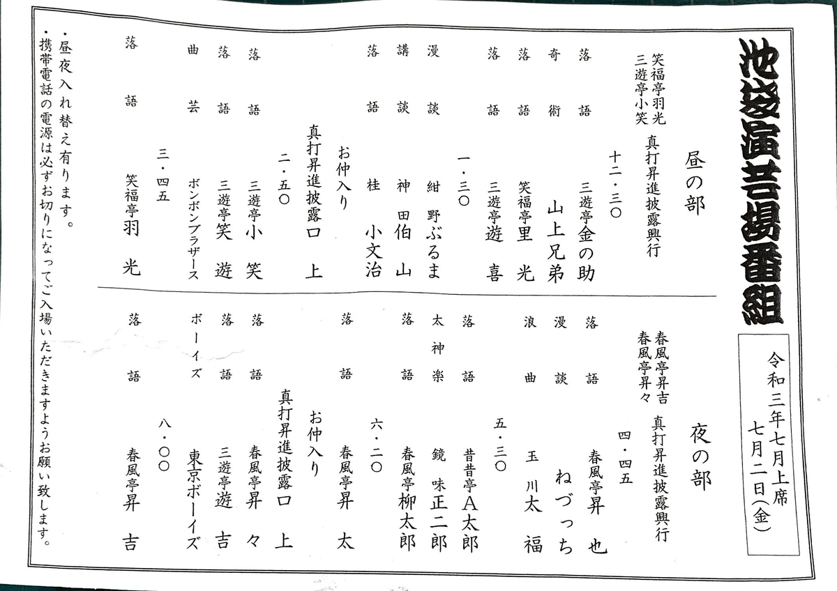 7月2日、池袋演芸場、昼の部。